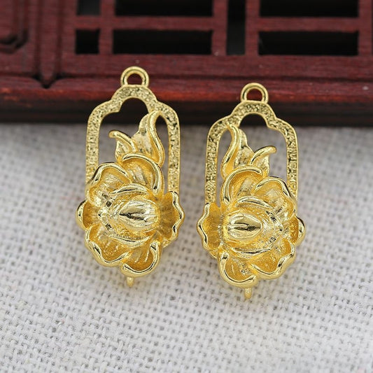 2PCS 24K Gold Plated Brass Lotus Connector Charm 11x21mm, Double-Hole DIY Focal Pendant, Fade-Resistant Hairpin Headdress Finding for Chinese Style Jewelry