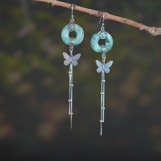 Myanmar Donut Jadeite Earring, S925 Butterfly Earring, Retro Tassels Earring, Gift for Her