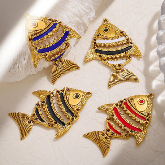 Moving Fish Design Gold-Plated Hollow Stainless Steel Pendants, Enameled Ocean Fish Series Charms for Necklace Making, Handmade Jewelry Accessories
