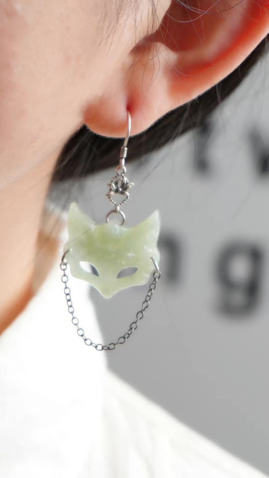 Natural Xiuyu Jade Fox Mask Earrings, S925 Sterling Silver Dangle Earrings, Handcrafted Jade Jewelry, Unique Chinese Mythical Animal Gift for Women