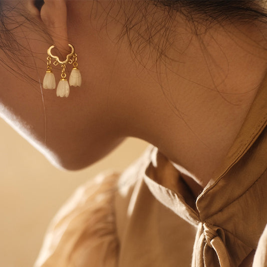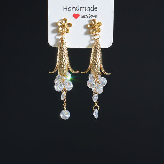 Vintage Bellflower Tassel Earrings, Long Drop Earrings with Natural Zircon, Retro Floral Dangle Earrings, Handmade Statement Jewelry for Women