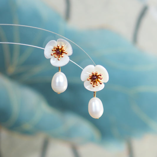 Natural Mother of Pearl Flower with Pearl Dangle Drop Earrings, Gold Plated S925 Sterling Silver Pearl Stud Earring, Mother's Day Gift