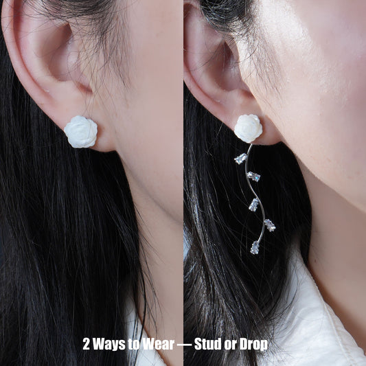 .925 Sterling Silver Carved Mother of Pearl Shell Rose Studs Earrings for Women, Natural Gemstone, White Flower Drop Bridal Jewelry As Summer Tassel Earrings for Wedding Gifts