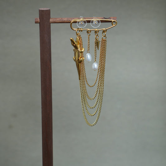 Gold Crocodile Brooch with Pearls, Vintage Alligator Pin with Chains