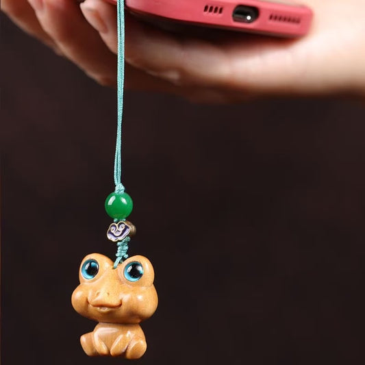 Sandalwood Carved Frog Phone Charm, Handcrafted Wooden Frog Pendant, Handmade Wood Keychain, Lucky Animal Totem Gift