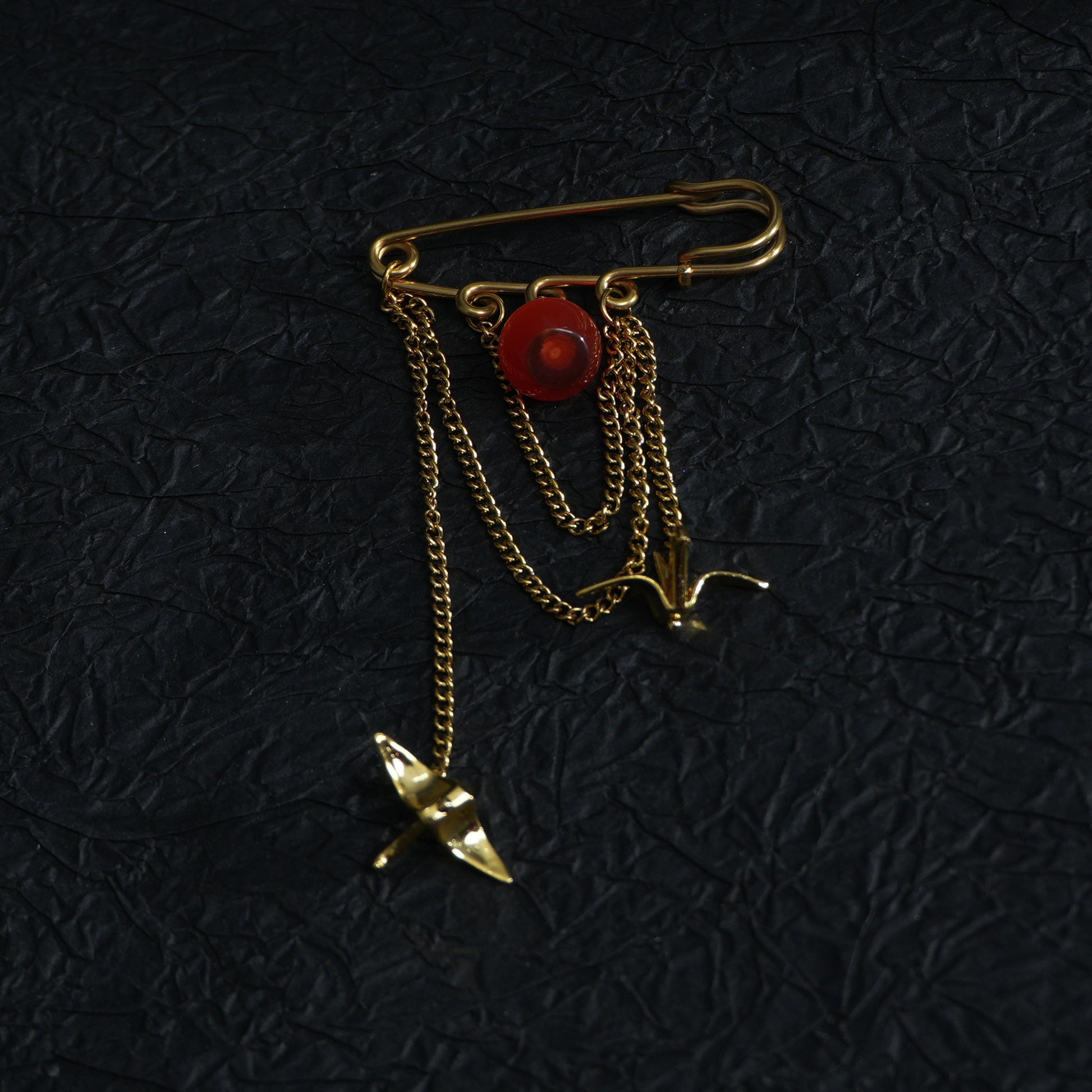 Featuring polished gold origami cranes (symbols of wishes & longevity) and a vibrant red cats eye apple (for vitality & protection), this piece reimagines classic motifs with a sleek twist. The cascading chains add playful movement, turning the vintage-style safety pin into a eye-catching accent for jackets, sweaters, or dresses.