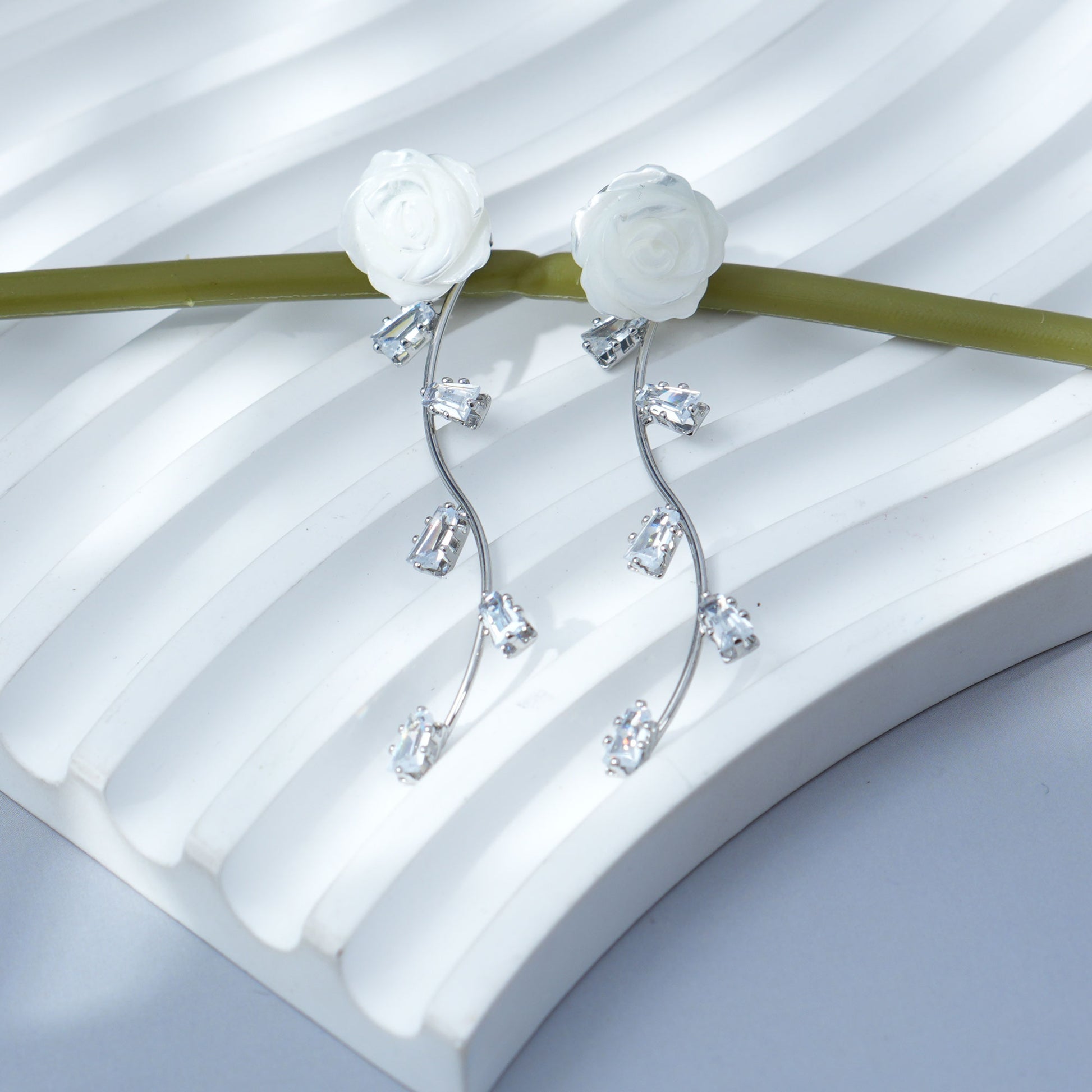 .925 Sterling Silver Carved Mother of Pearl Shell Rose Studs Earrings for Women, Natural Gemstone, White Flower Drop Bridal Jewelry As Summer Tassel Earrings for Wedding Gifts