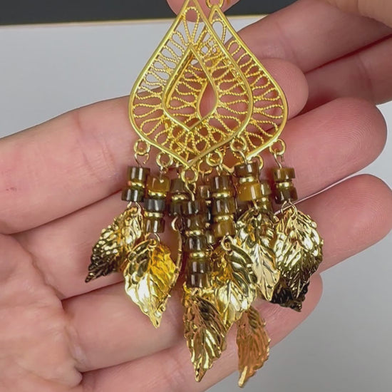 Bring warm, earthy elegance to your look with these handcrafted tassel earrings. Made with natural Tiger Eye gemstones and 24K gold-plated brass components, each pair displays the stone’s beautiful golden-brown shimmer and layered texture. The leaf silhouette paired with soft tassels adds a graceful bohemian touch, perfect for both everyday wear and special occasions.