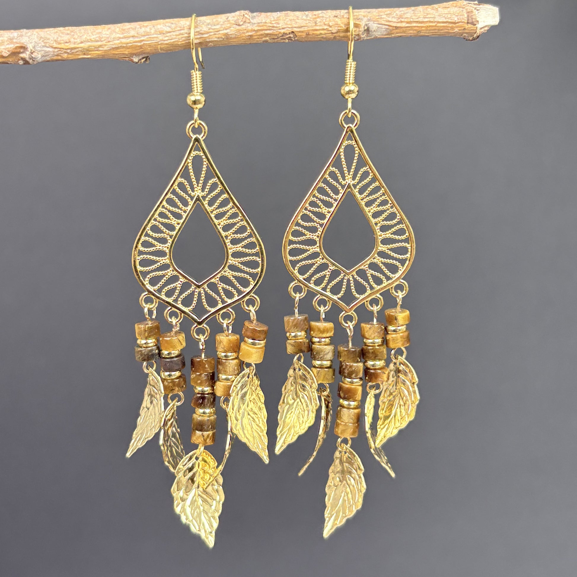Natural Tiger Eye Leaf Tassel Earrings, Boho Dangle Earrings for Women, Handmade Gemstone Jewelry