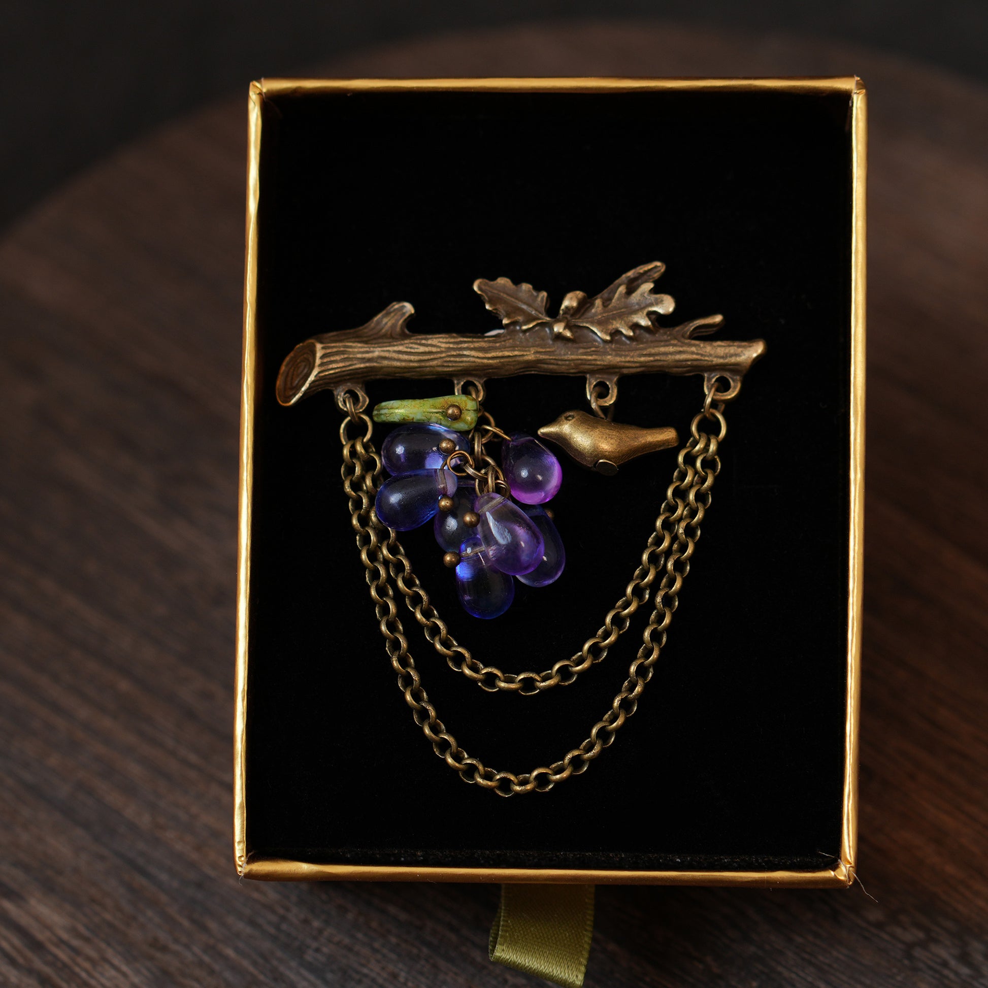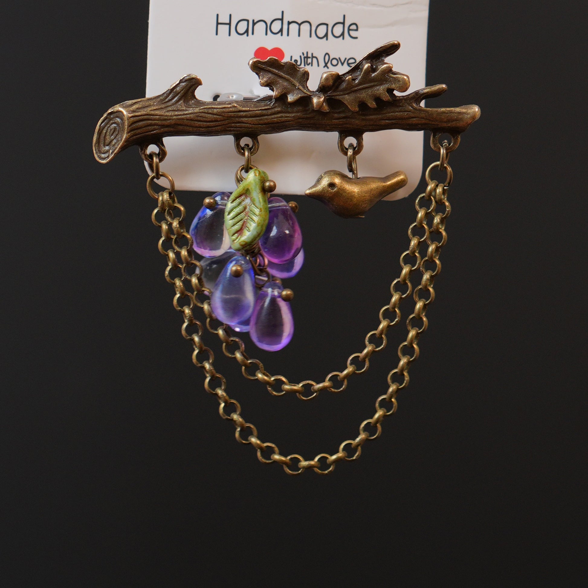 Handmade Grape & Bird Branch Brooch, Czech Glass Pin, Vintage Style Woodland Jewelry